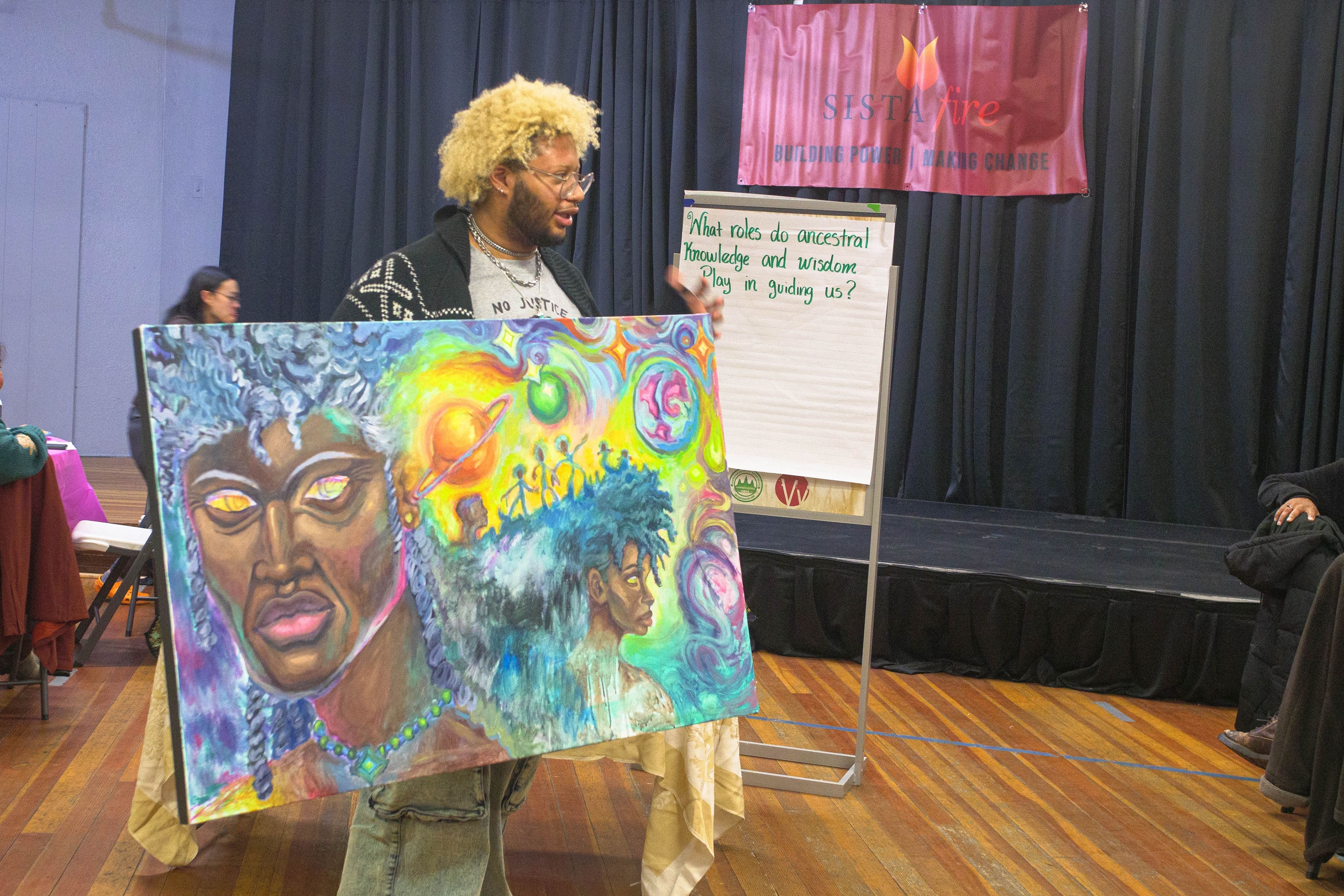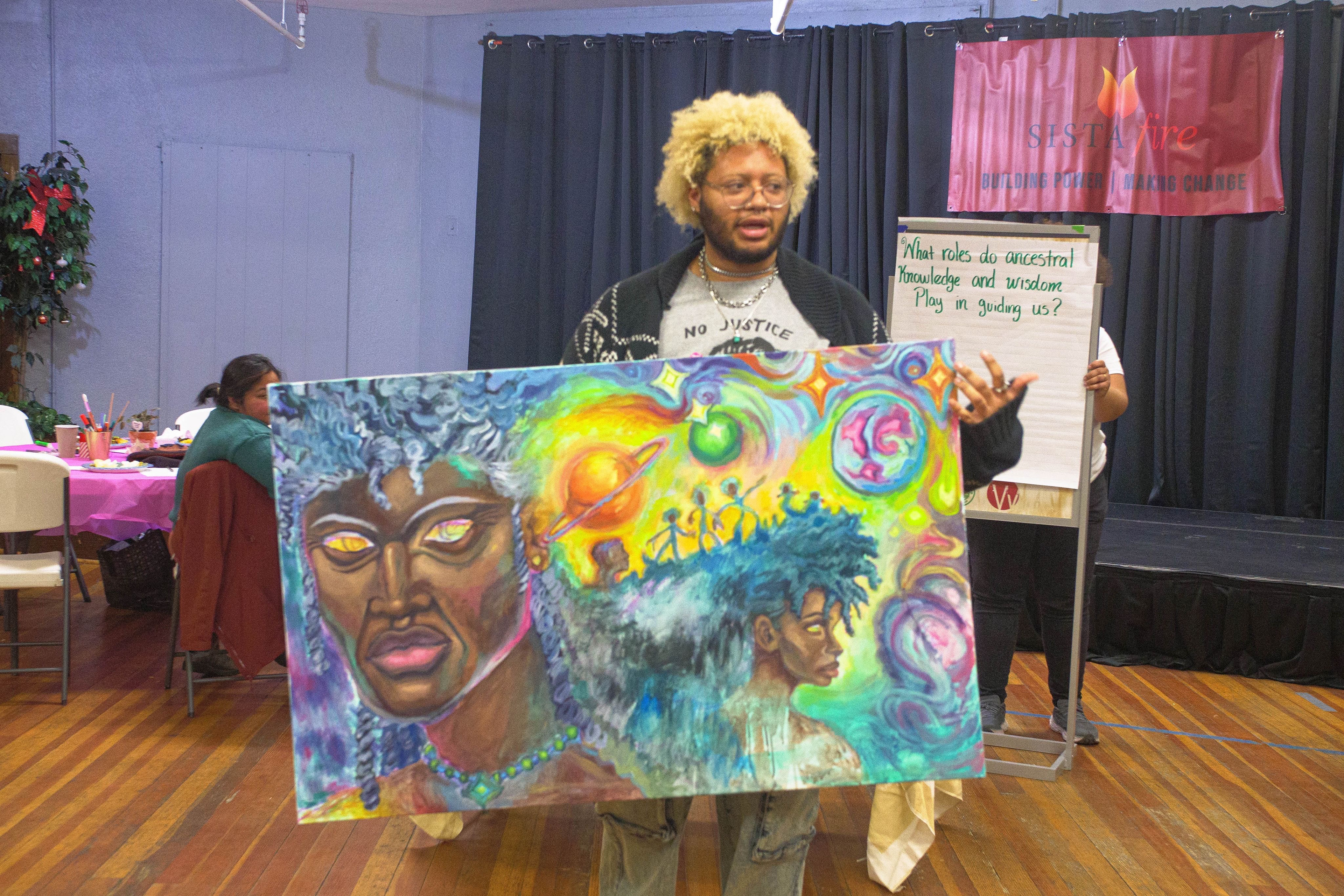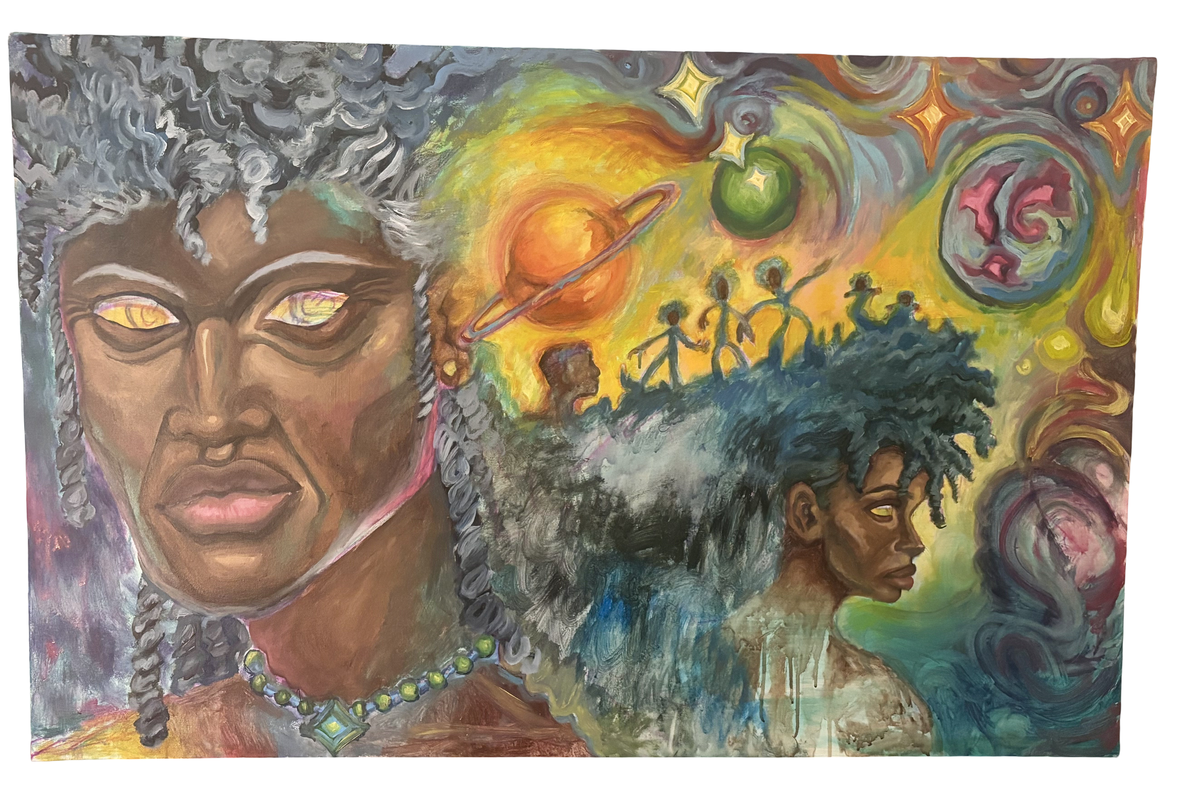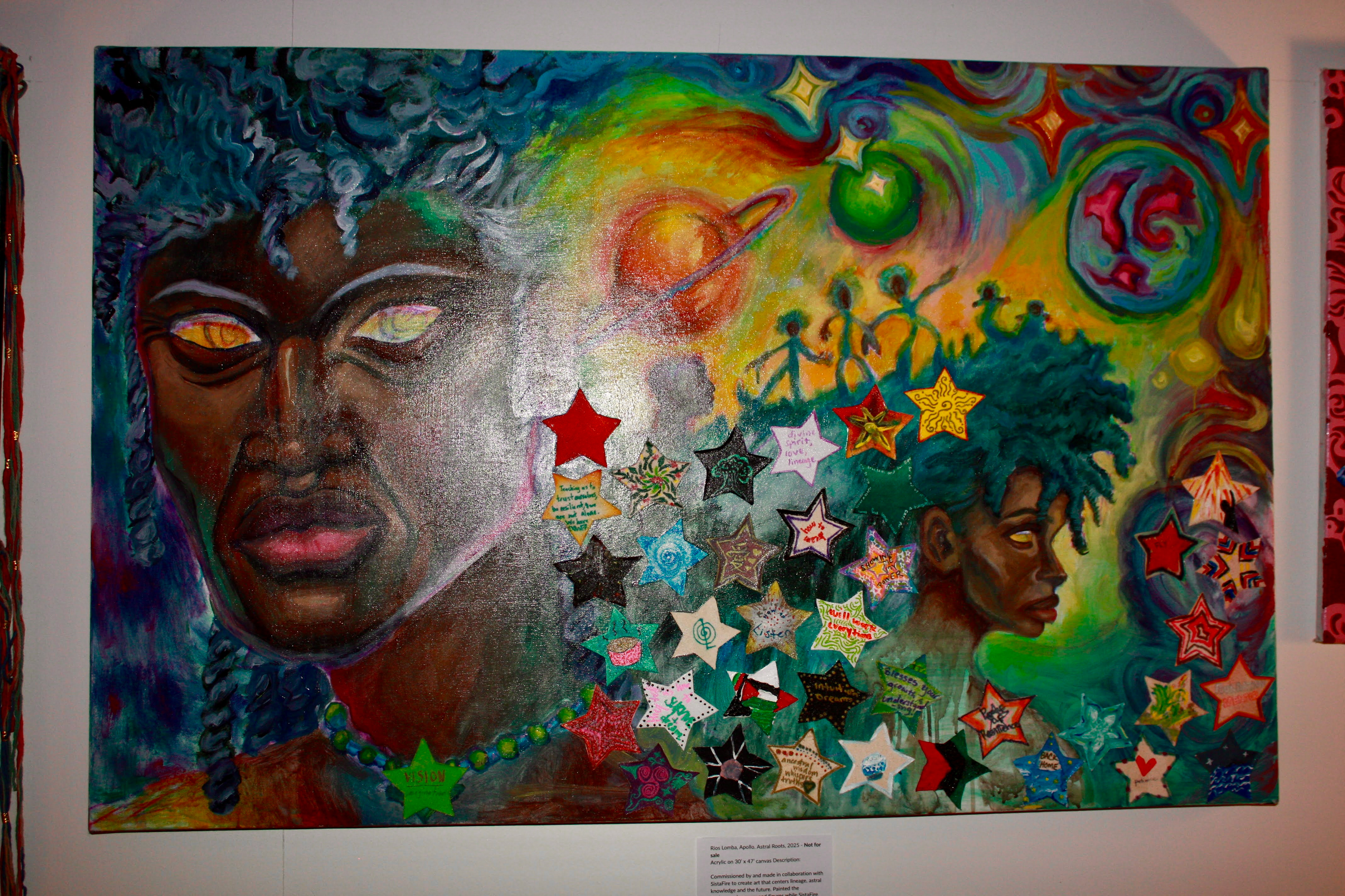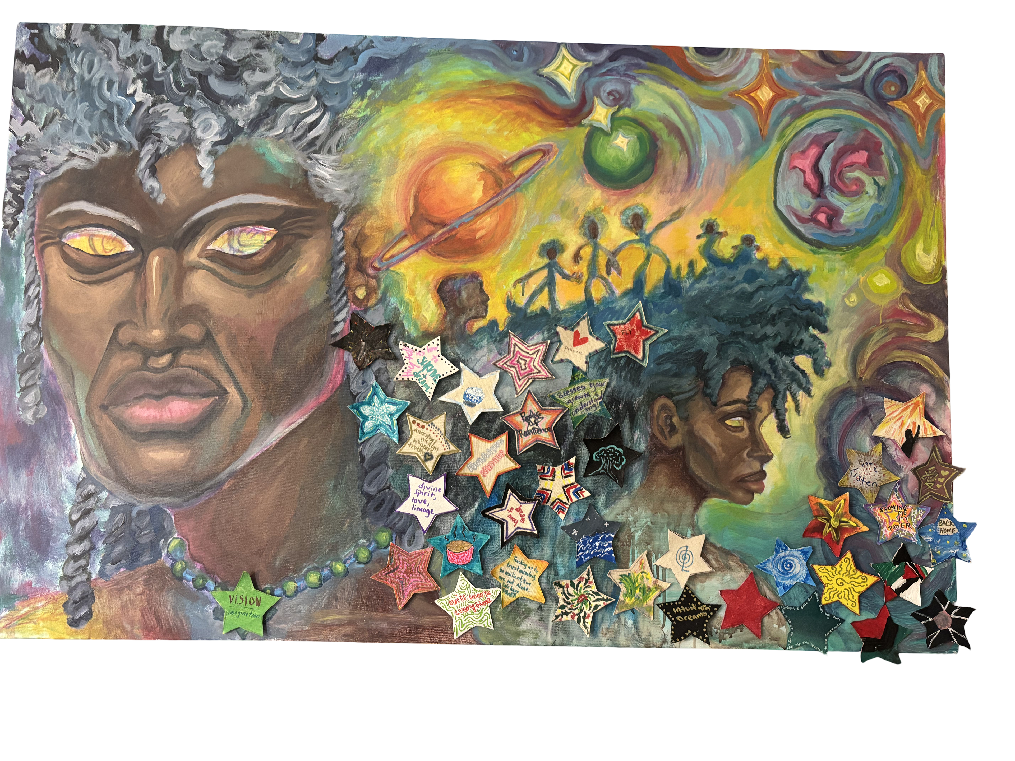 Astral Roots, 2024 Acrylic on 30’ x 47’ canvas Commissioned and made in collaboration with SistaFire to create art that centers lineage, astral knowledge, and the future. Painted the background scenery of figures and cosmic imagery. Then, lead a workshop where the SistaFire members painted on canvas stars that reflected on "what roles do ancestral knowledge and wisdom play in guiding us?"