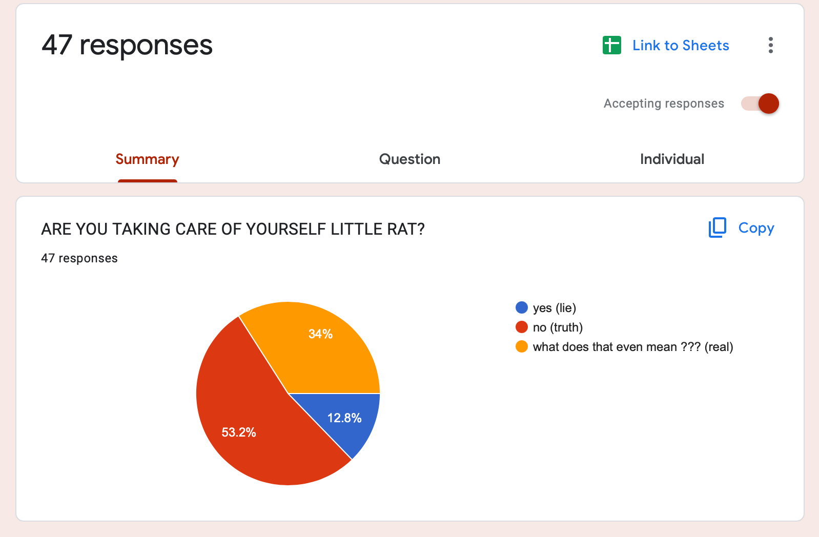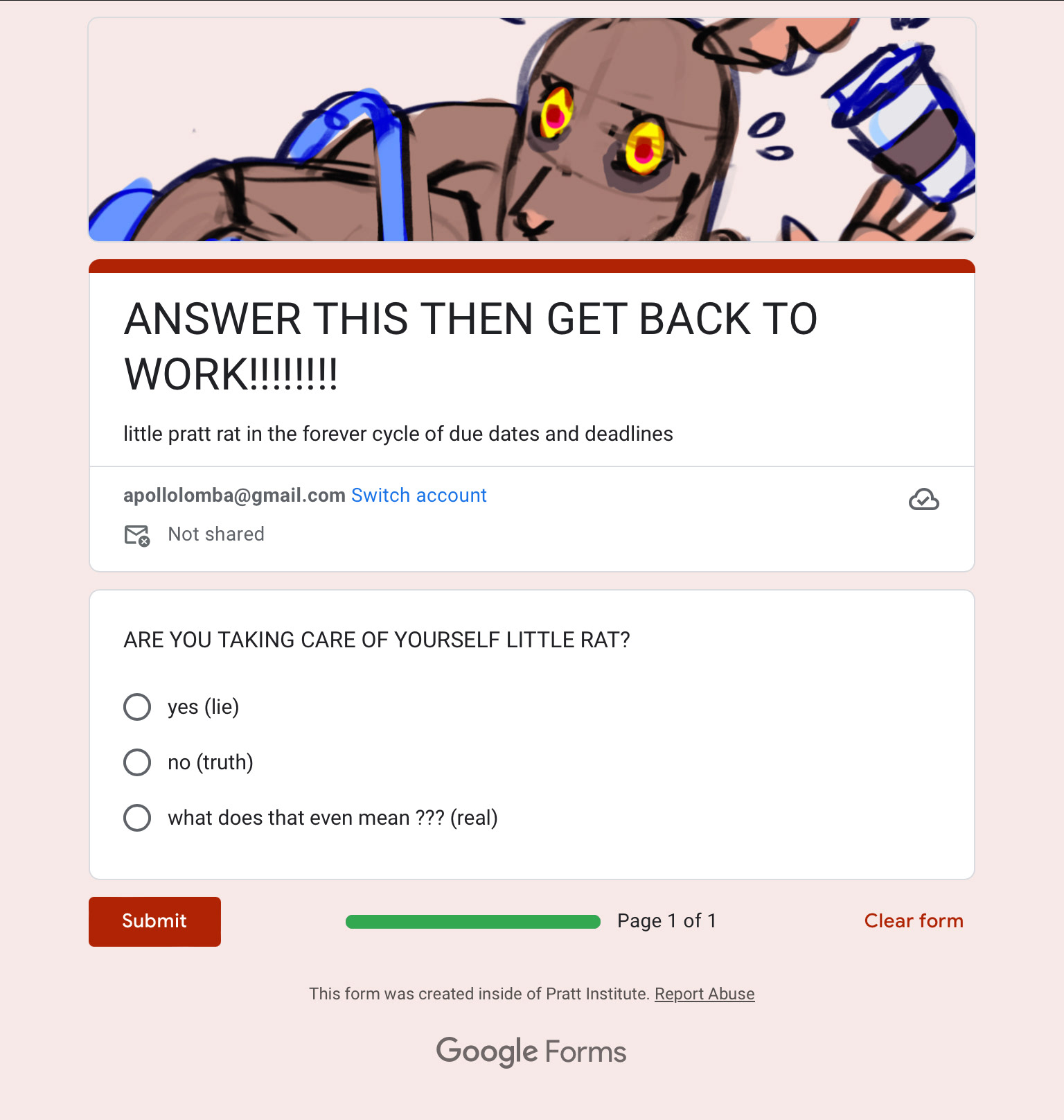The purpose of this project was to track the rate of burnout and self care on the Pratt campus by having students interact with the posters of the anxious rat character.